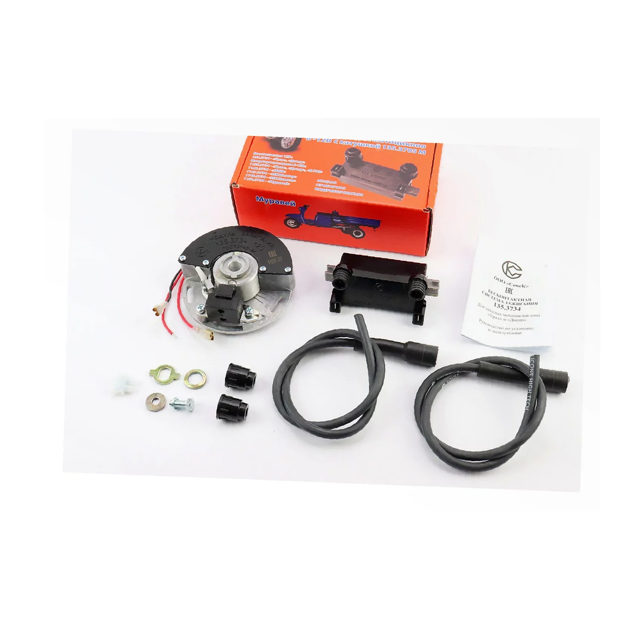 БСЗ/безконтактна система запалювання 135.3734 з новою котушкою 135.3705М 12V, з силіконовими чорними бронепроводами і надсвічниками МТ, УРАЛ, МТ, УРАЛ, К-750