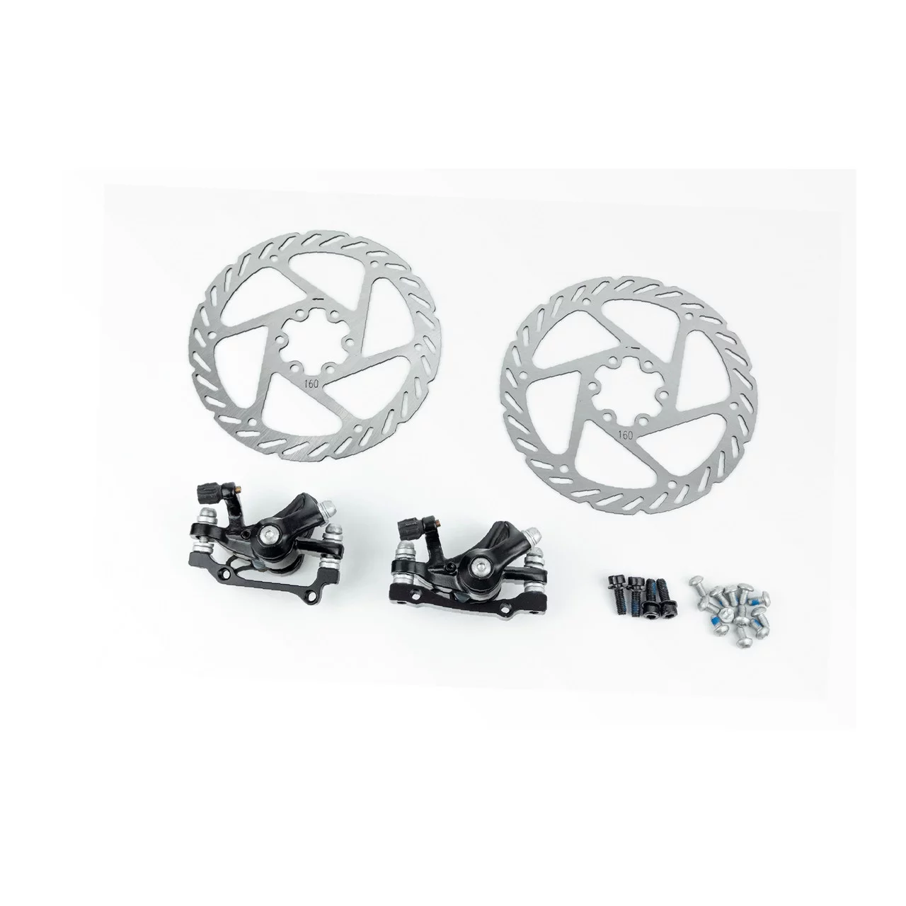 Гальмо Disk-brake переднє (F160/R140мм)+заднє (F180/R160мм), диски 160мм, кріпл. 6 болтів, чорні DX-2007, ВЕЛОЗАПЧАСТИНИ