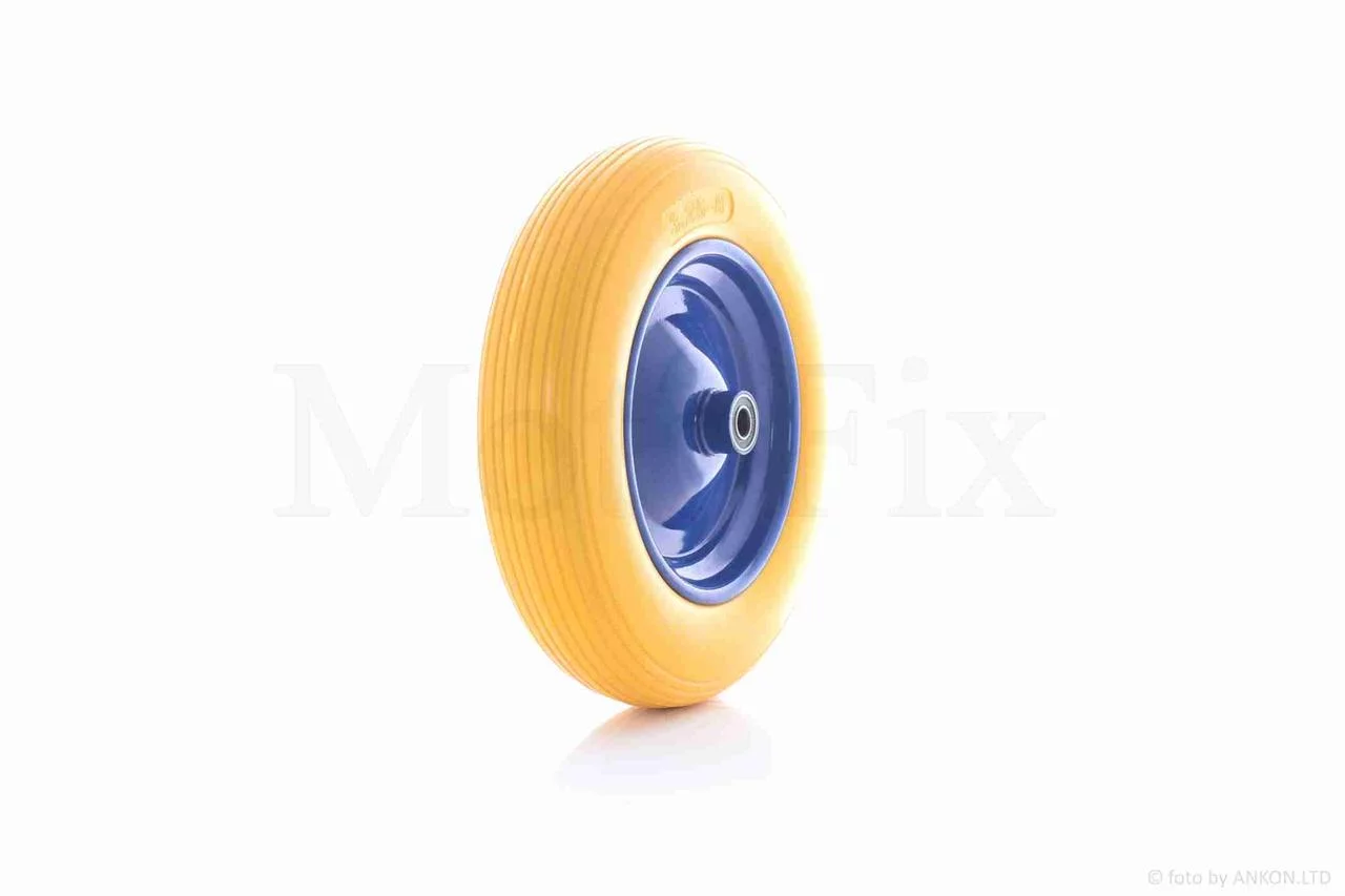 Відгуки Колесо для тачки у зборі 3.25-8 (поліуретанове, жовте, синій диск, підшипник 6202 Ø16), QT-034668