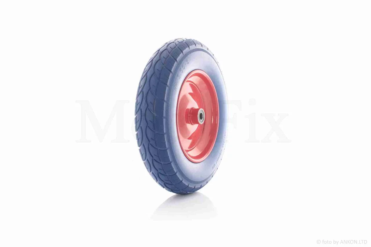 Відгуки Колесо для тачки у зборі 3.50-8 (поліуретанове, синє, червоний диск, підшипник 6202 Ø16), QT-034671