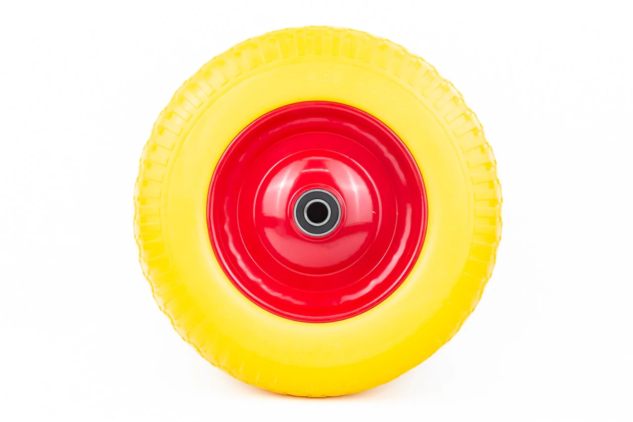 Колесо на тачку "ПІНОПОЛІУРЕТАН" 4,00-8, пром-підшипники під вісь 20мм, жовто-червоне, ШИНИ