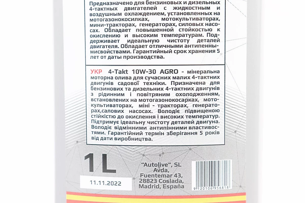 Олива 4T 10W-30 - мінеральна універсальна "AGRO" 1L