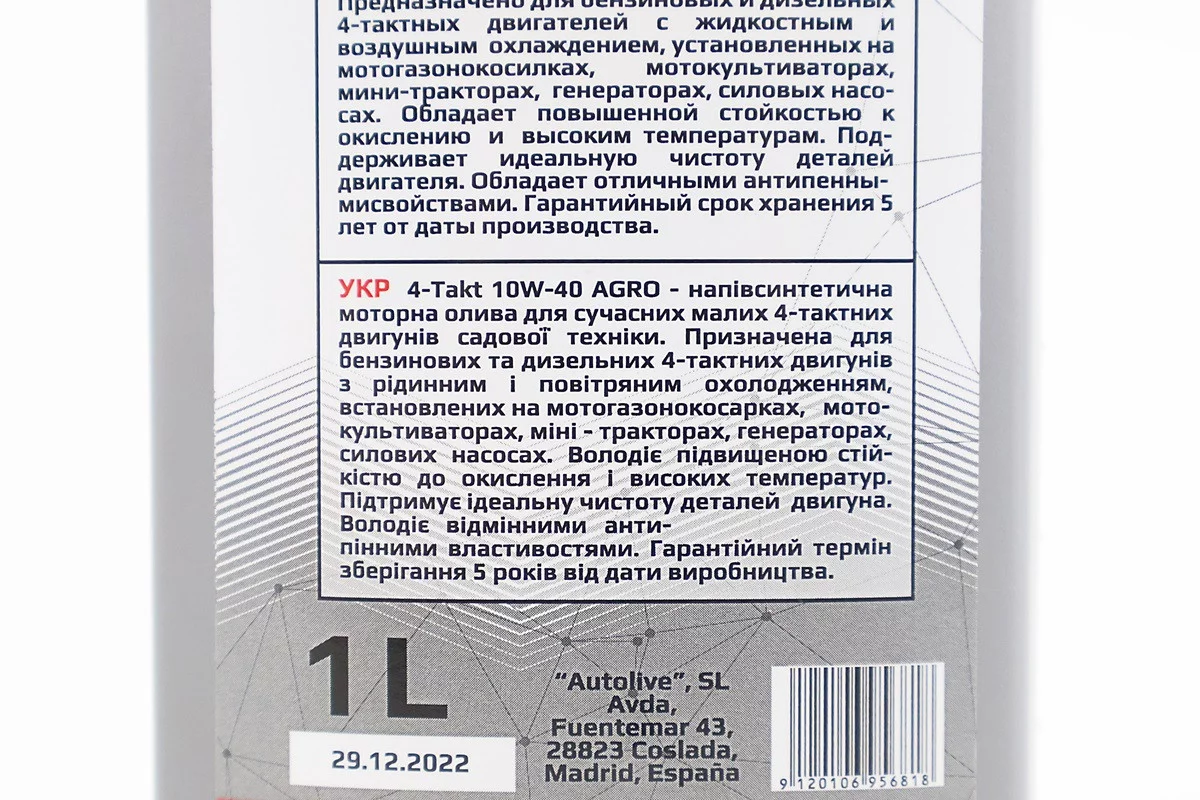 Олива 4T 10W-40 - мінеральна універсальна "AGRO" 1L