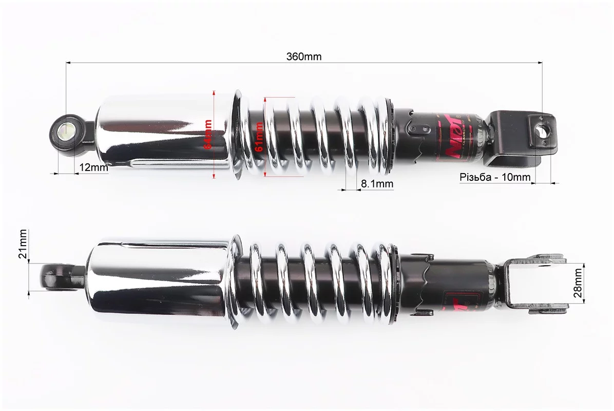 Отзывы Амортизатор задний 360mm*d64mm (втулка 12mm / вилка 10mm) со стаканом регулир., хром к-кт 2шт, FIX-341274