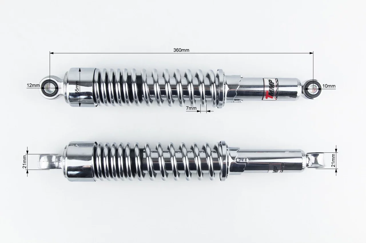 Отзывы Амортизатор задний JH/CB/CG-360мм*d55мм (втулка 12мм / втулка 10мм) со стаканом регулир., хром к-кт 2шт, ЗЧ-МОТО, YQ-351488