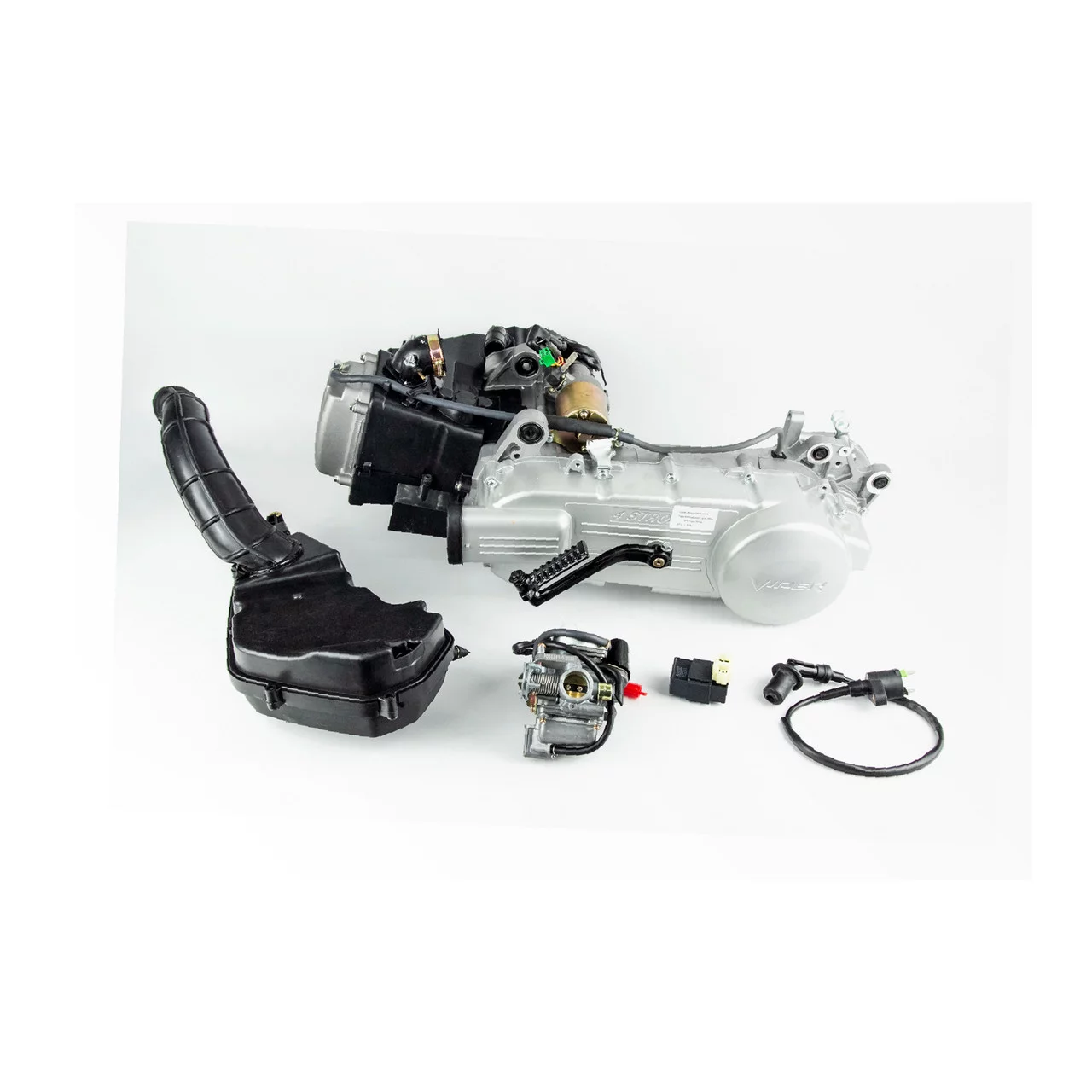 Двигатель скутерный в сборе 150куб (длинный вариатор, длинный вал)+карбюратор, коммутатор, катушка зажигания, фильтр воздушный тип