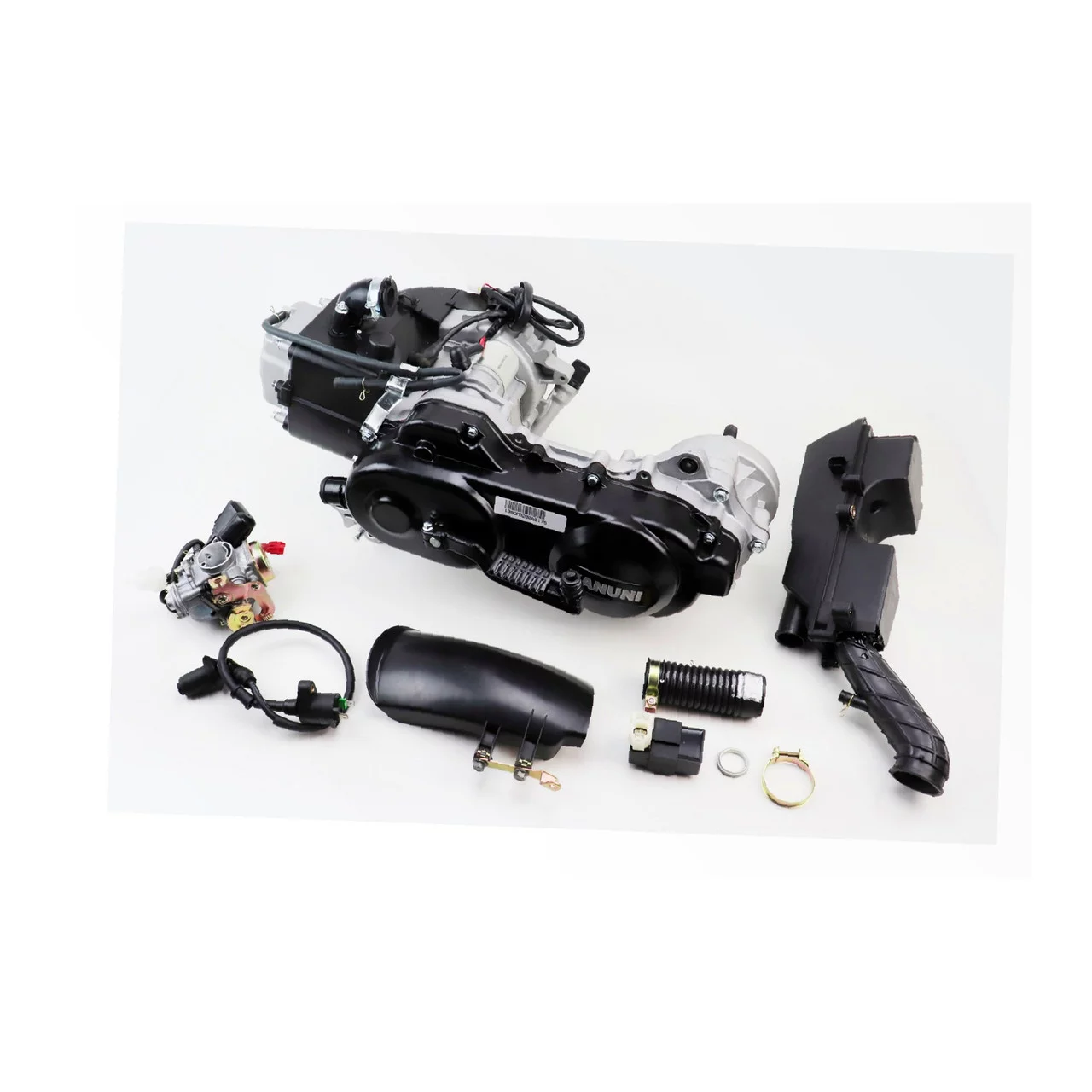 Двигатель скутерный в сборе 4Т-80куб (короткий вариатор, длинный вал)+карбюратор, коммутатор, катушка зажигания, фильтр воздушный,
