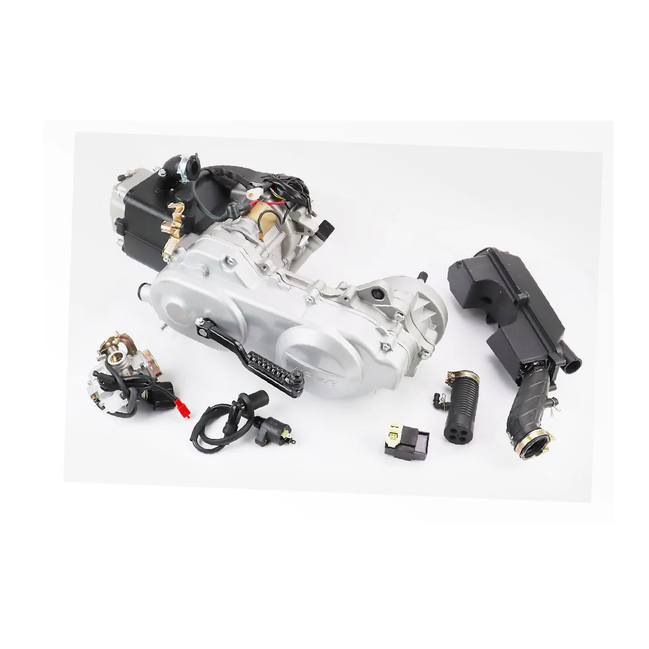 Двигатель скутерный в сборе 4Т-80куб (короткий вариатор, длинный вал)+карбюратор, коммутатор, катушка зажигания, фильтр воздушный,
