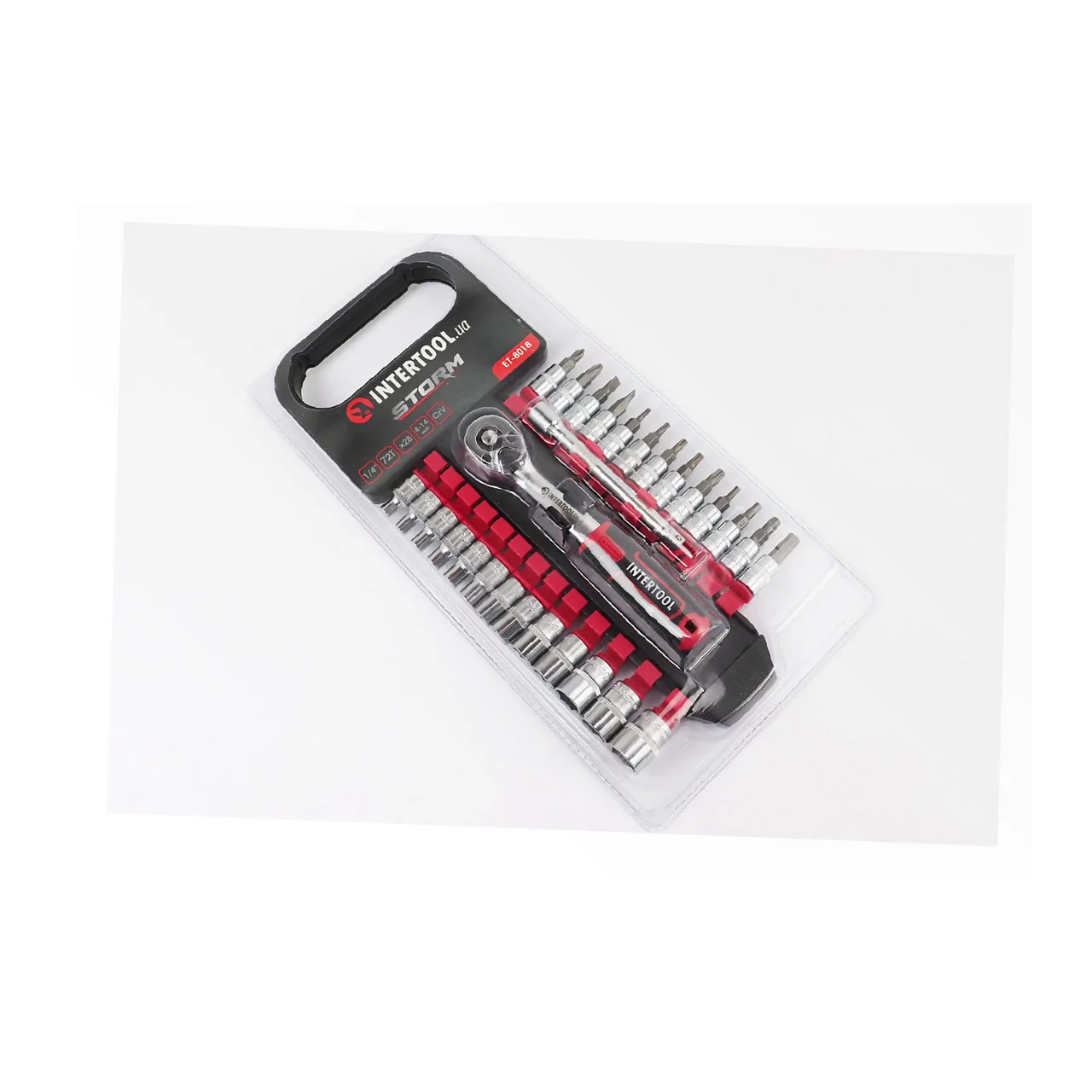 Набор головок торцевых c трещоткой (изогн. рукоятка) 1/4" CrV 72 зуба + удлин. 1/4" 100мм 26шт (4/4,5/5/5,5/6/7/8/9/10/11/12/13/14мм + насадки) (ET-8018), Ручний інструмент