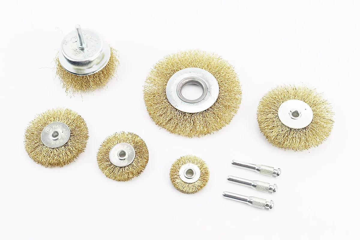 Набор щеток 6шт - торц./диск. со стержнем 1/4" D-75//40/50/63/75/100мм из латунированной рифленой проволоки 19-9600