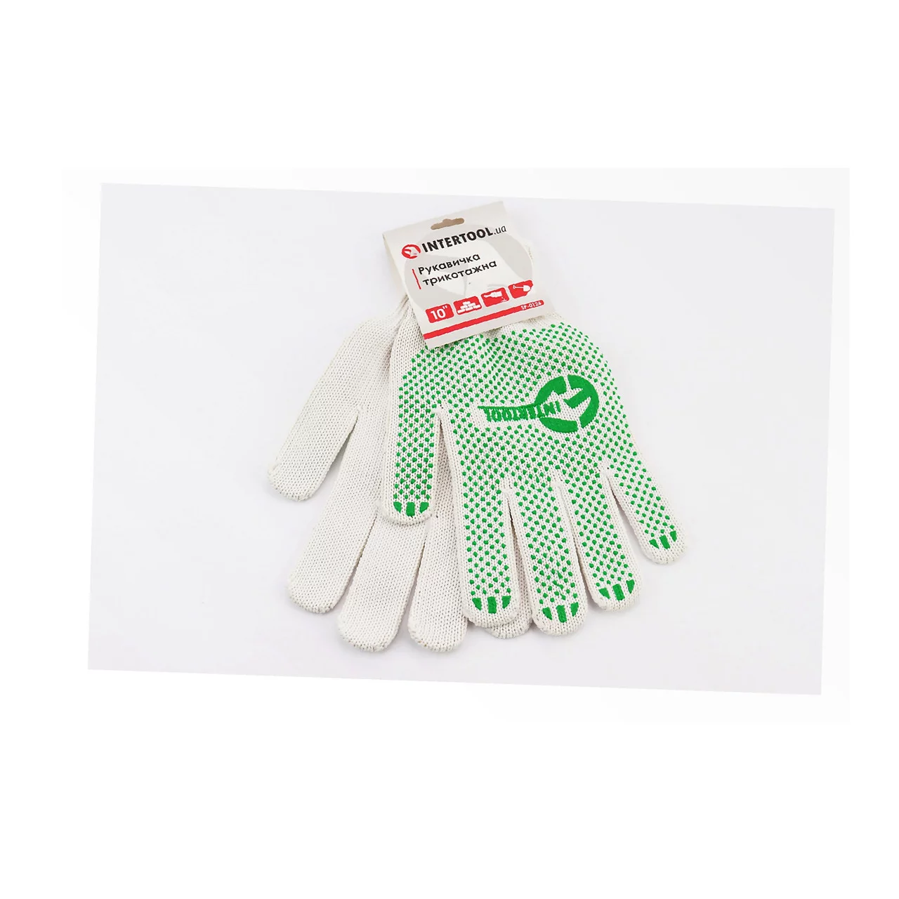 Перчатки рабочие 60% хлопок/40% полиэстер 10", класс вязки 7, белые зелёная ПВХ точка (SP-0126), Витратні матеріали