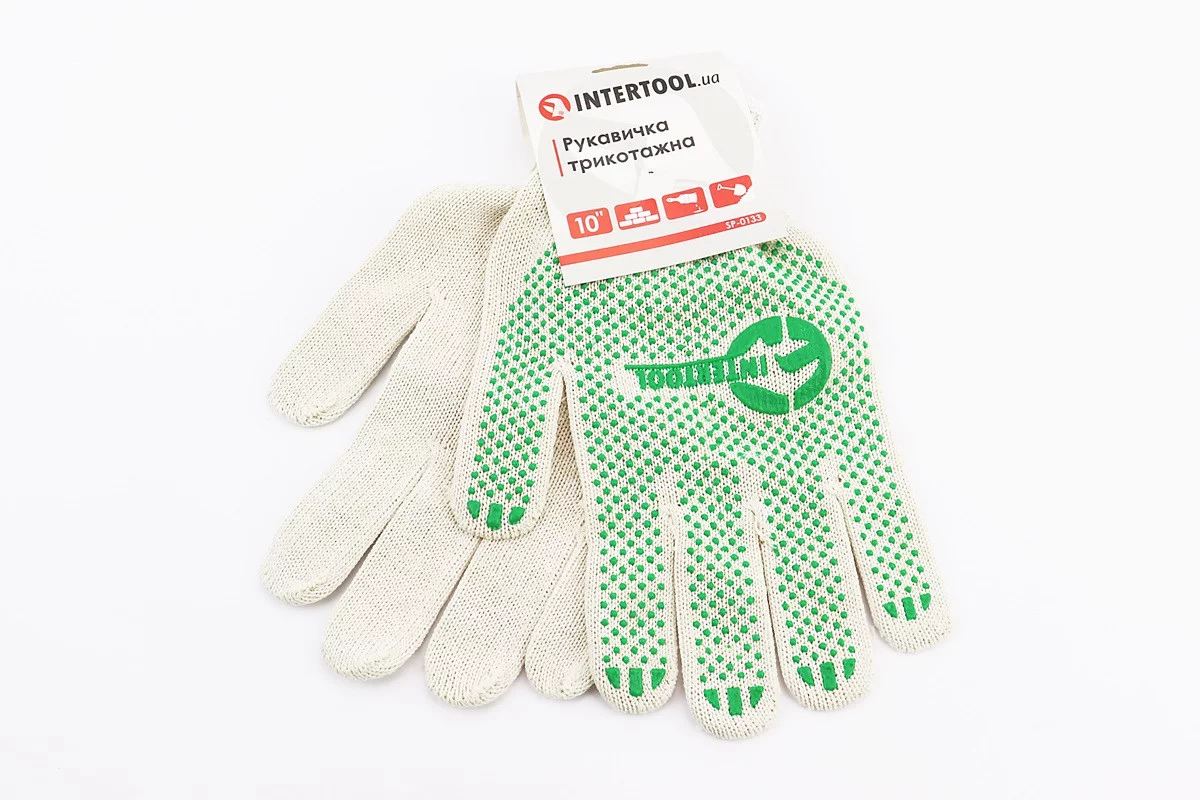 Перчатки рабочие 70% хлопок/30% полиэстер 10", класс вязки 10, белый, зеленая ПВХ точка SP-0133