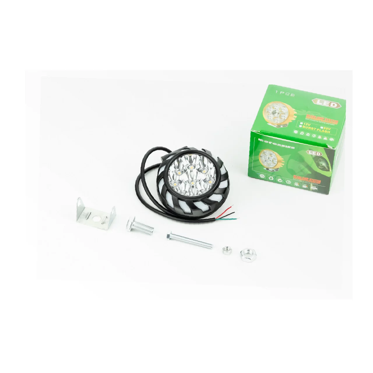 Фара дополнительная светодиодная влагозащитная-9 LED с креплением, 70мм с стробоскопом и разноцветной подсветкой, чёрный бортик, ЗЧ-МОТО