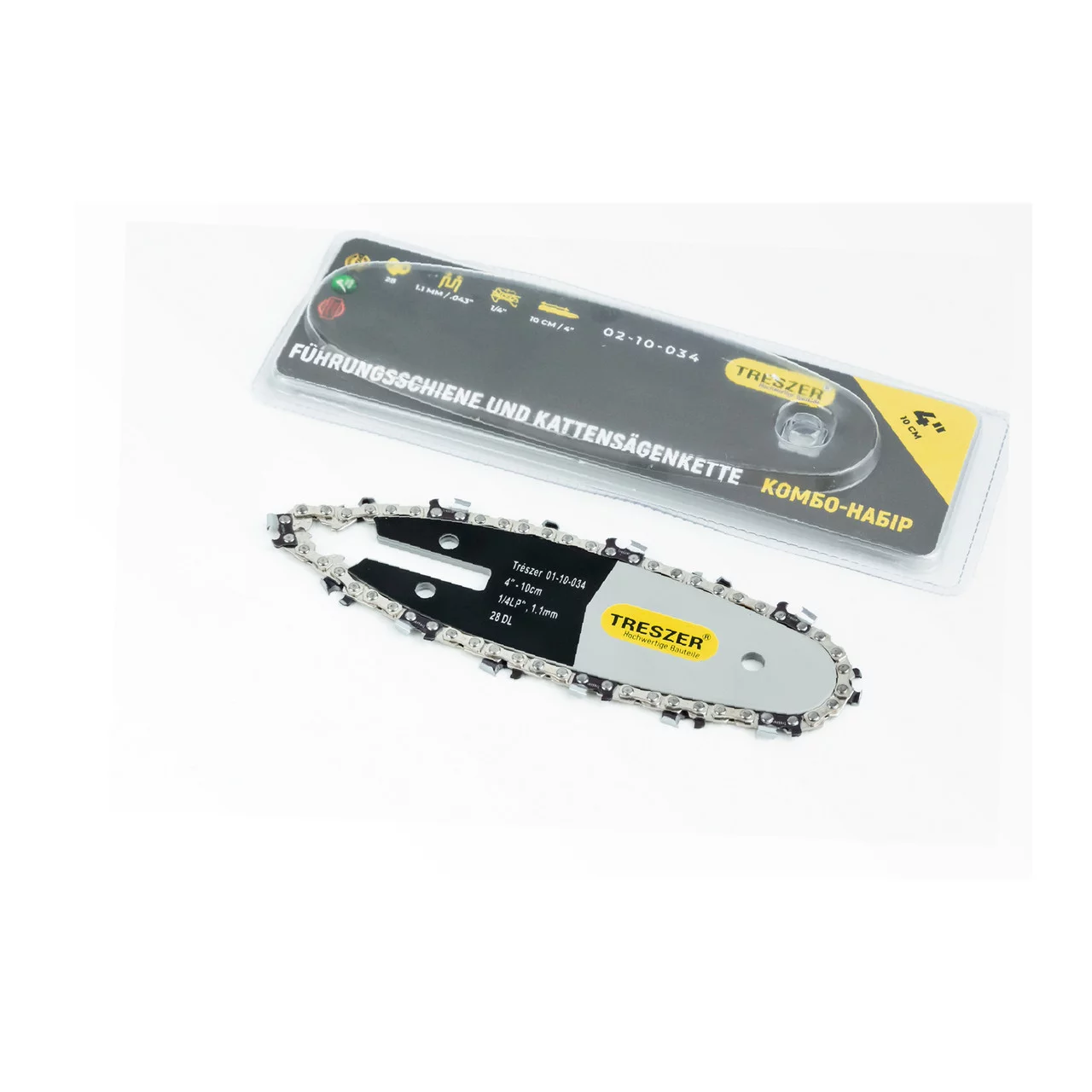 Шина 4"-1,1мм 1/4" 28зв L-13см (подходит на аккумуляторную мини-пилу) + цепь 1/4"-1,1мм-28зв. квад. зуб, на блистере, Б/П-РІЗНЕ,